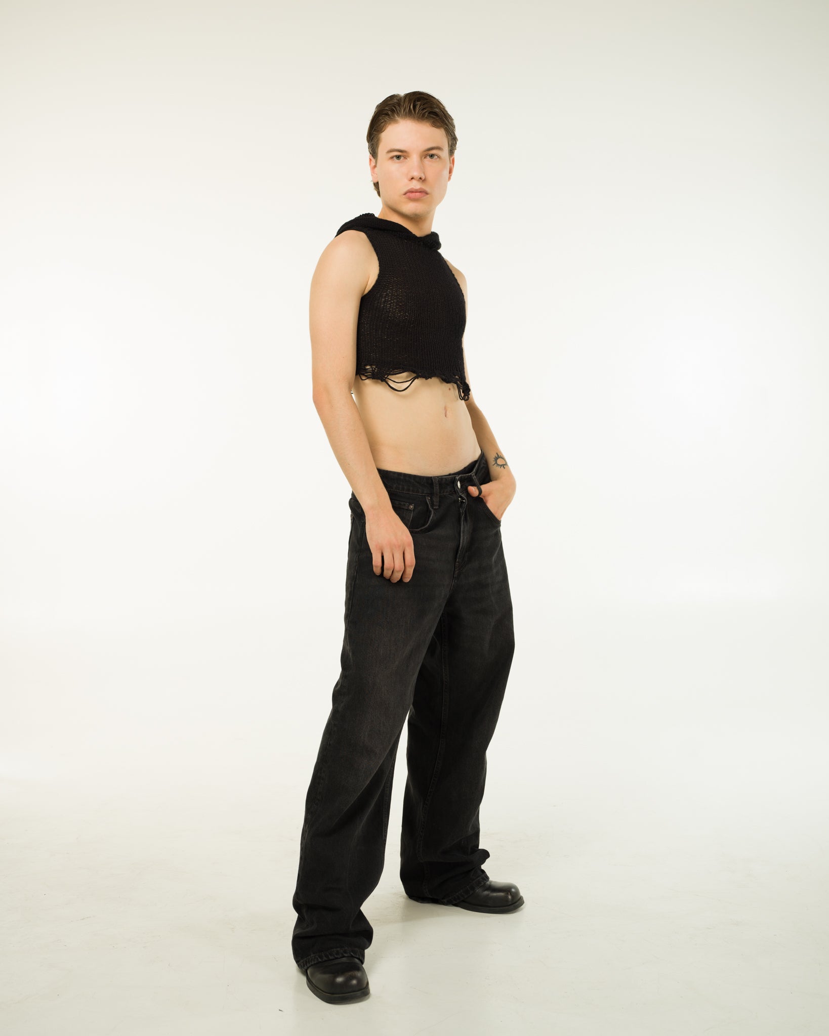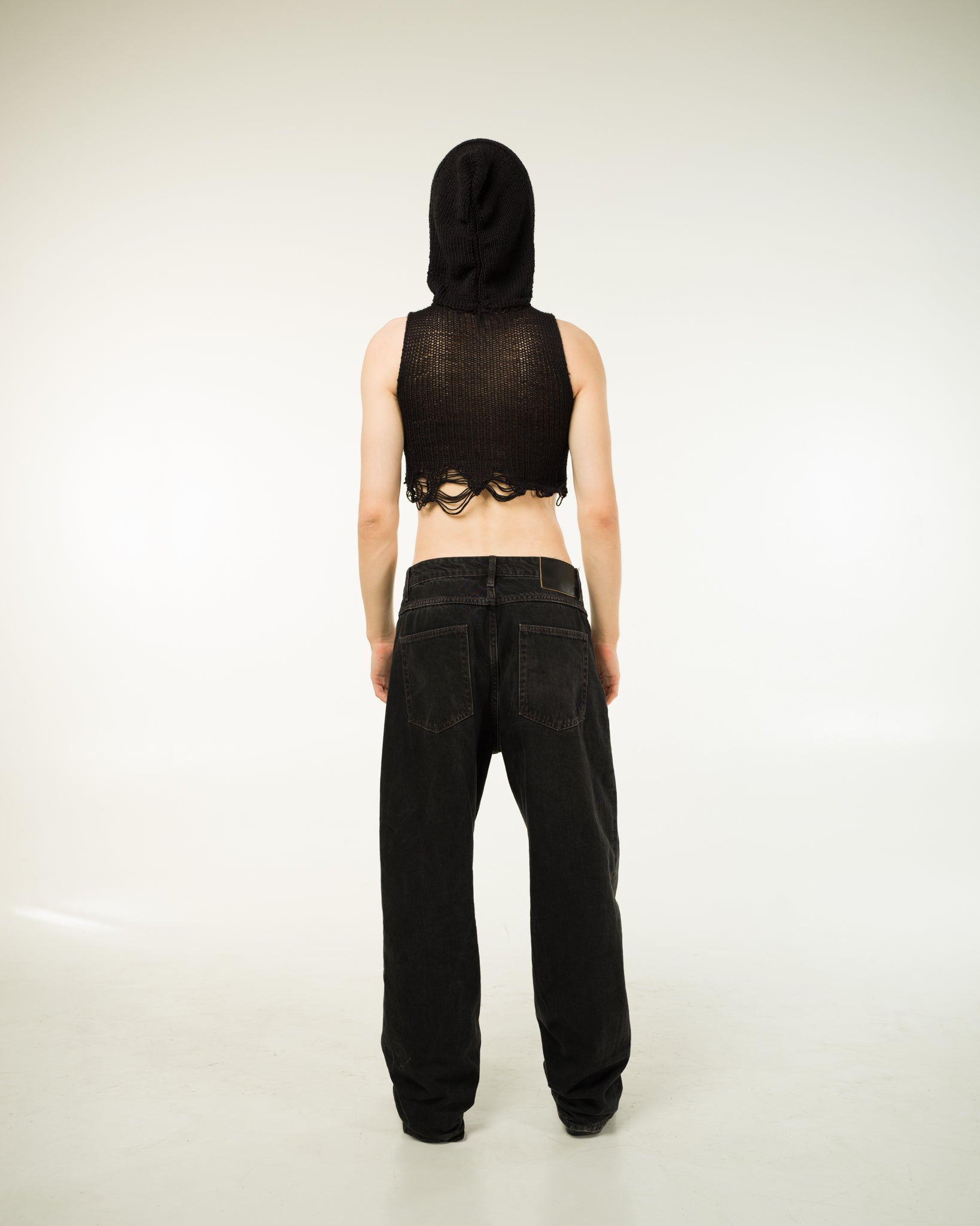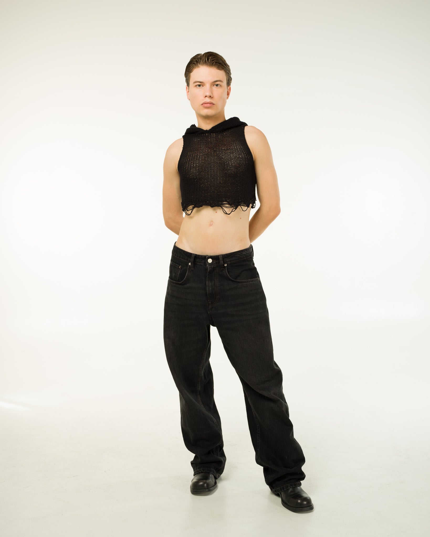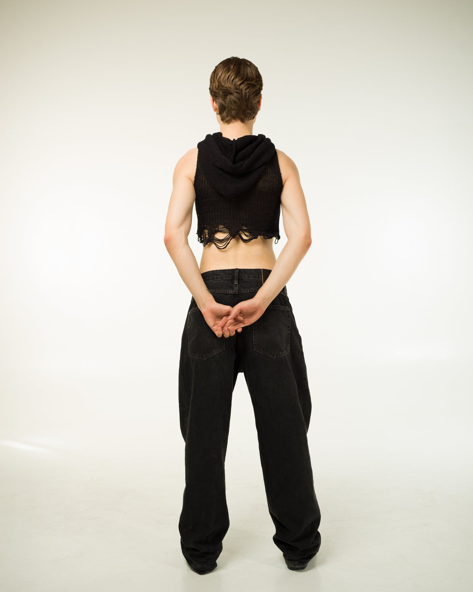 Top z kapturem, o ażurowej strukturze dzianiny, surowym, postrzępionym dole i zdekonstruowanym wykończeniu, co daje wrażenie strzępiącej się tkaniny.