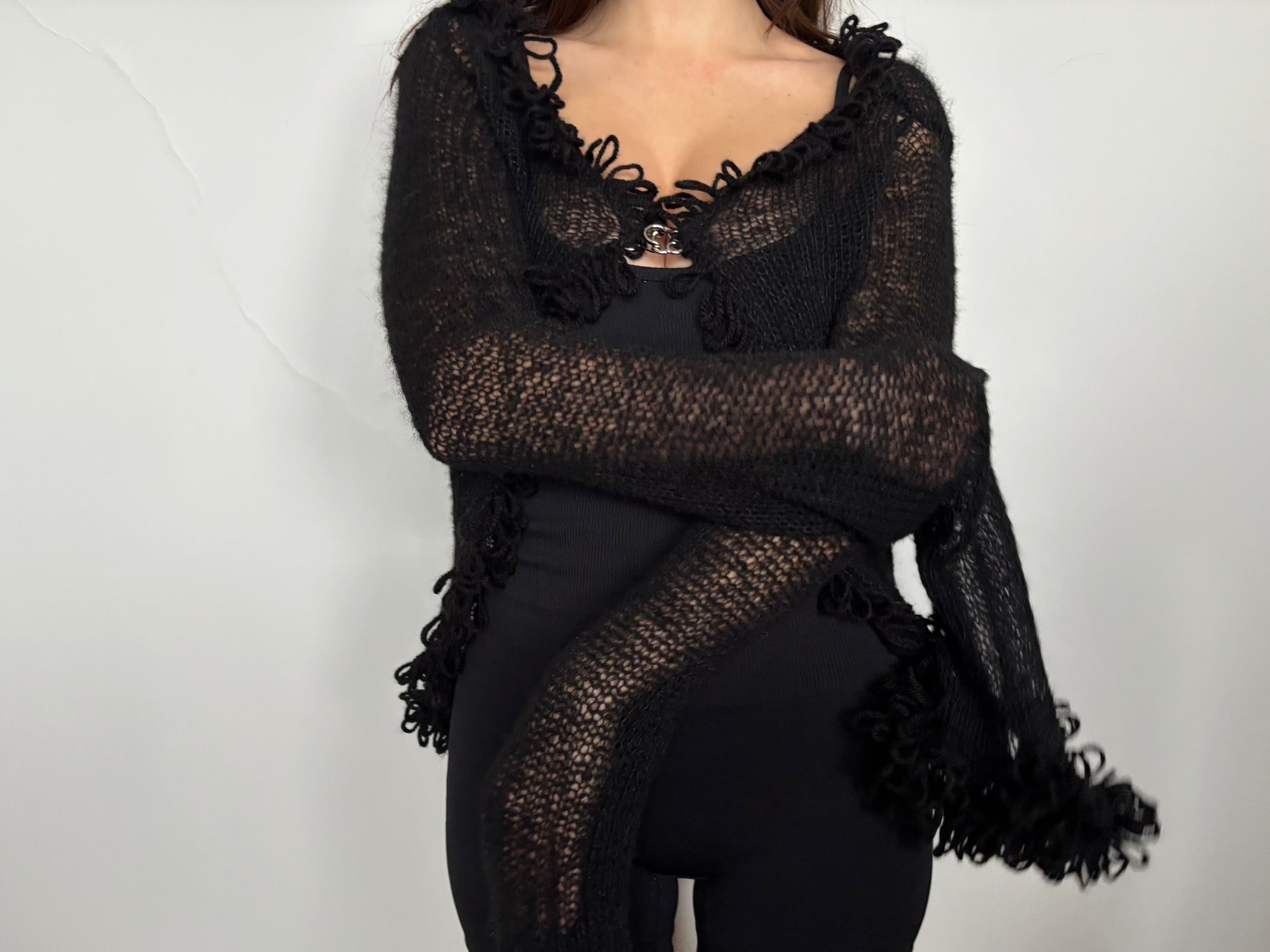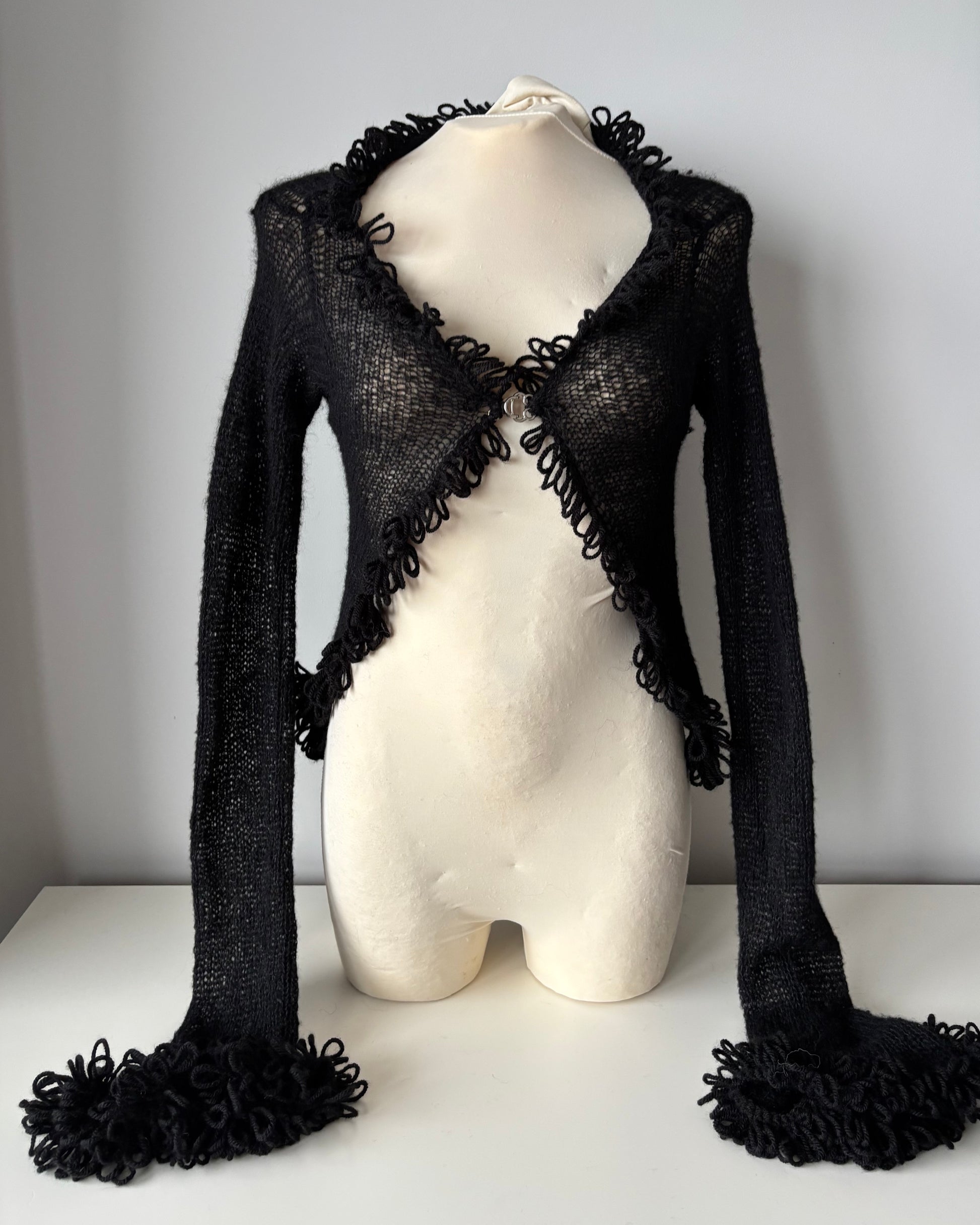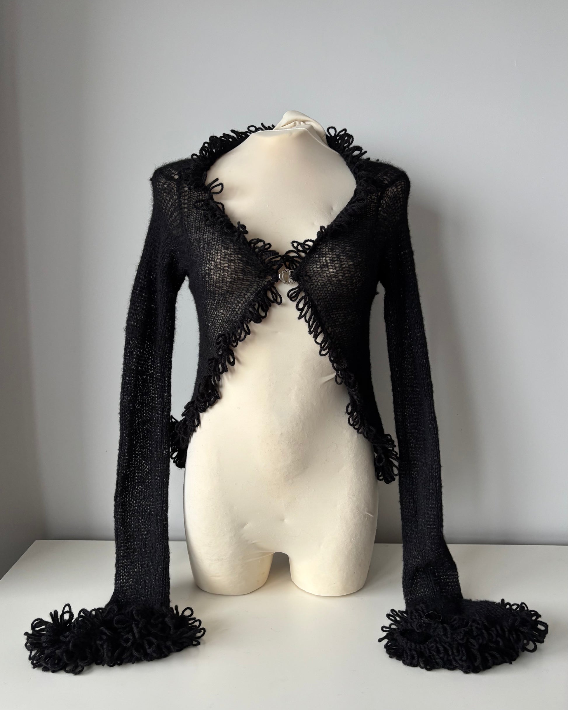 Unikatowy, w całości ręcznie wykonany kardigan z misternie dzierganymi „loops” tworzonymi na szydełku. Lekko przezroczysta, ażurowa struktura. Wykonany z włóczki o składzie 77% alpaka i 23% jedwab, włóczki 100% wełna oraz włóczki akrylowej.