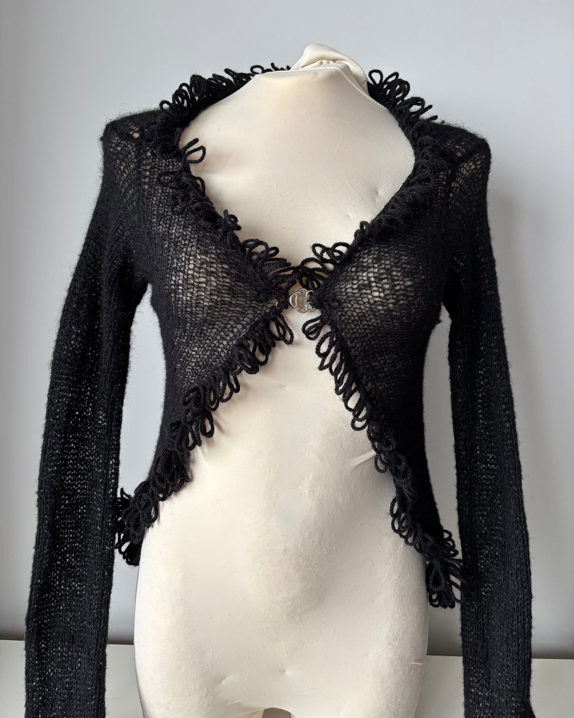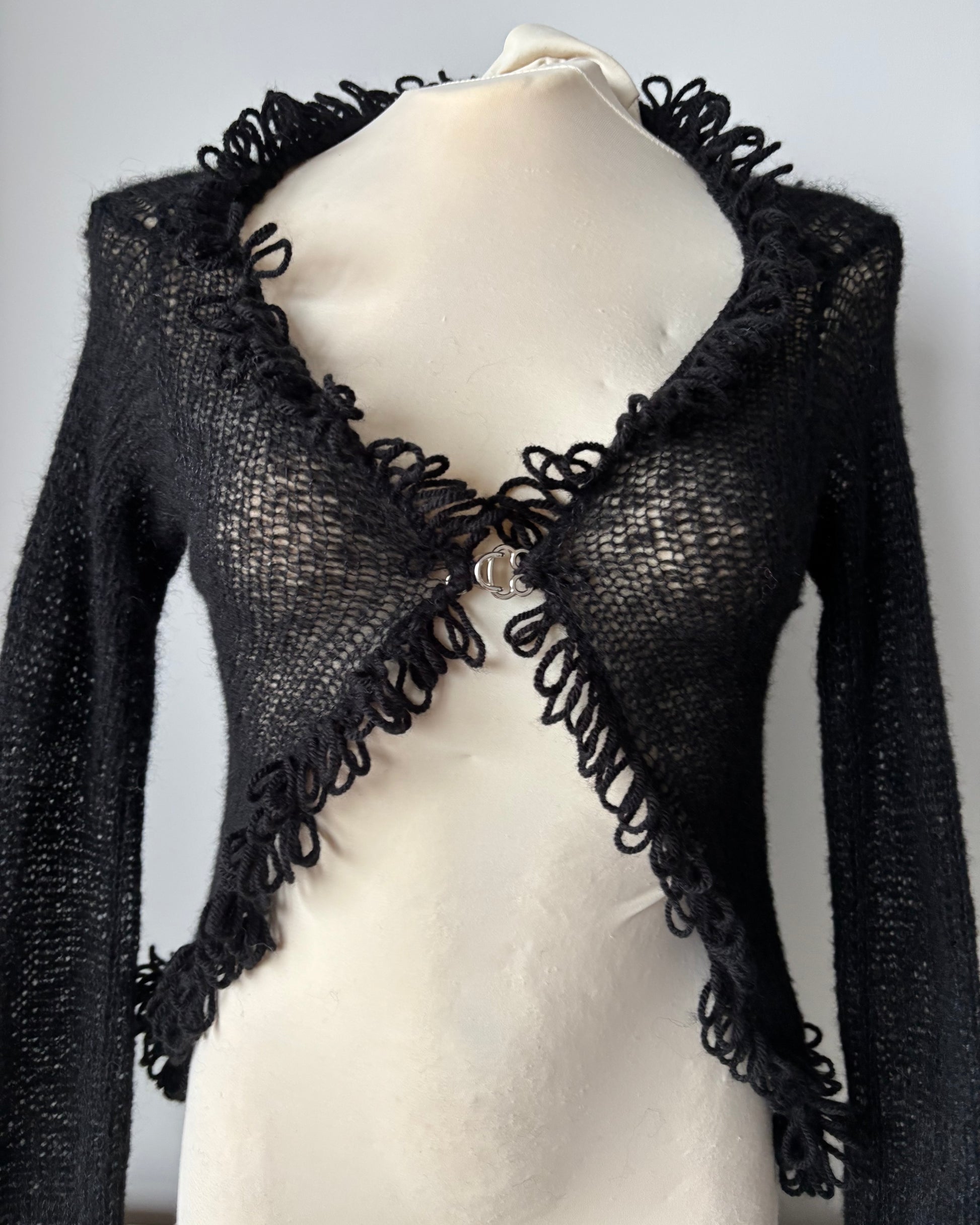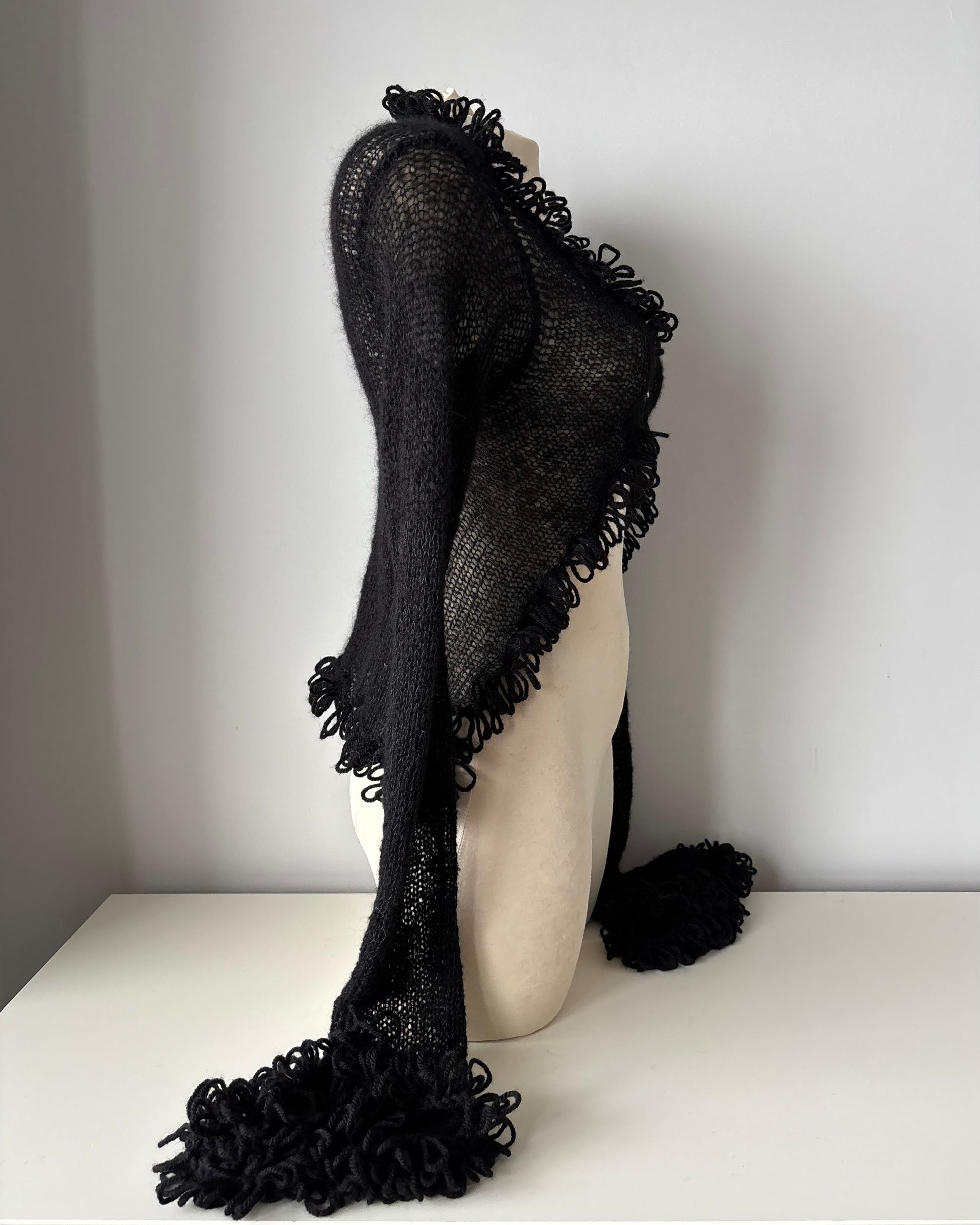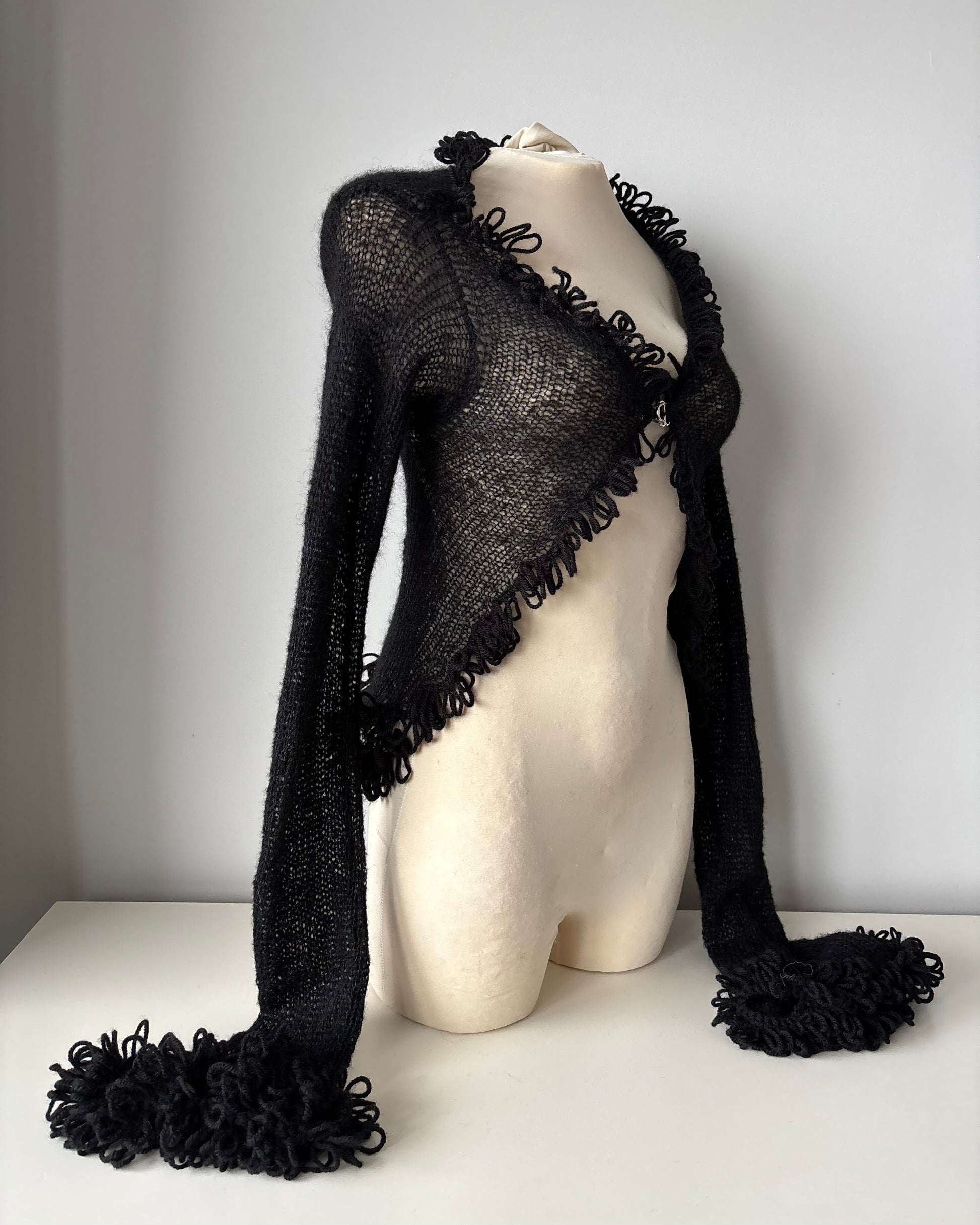 Unikatowy, w całości ręcznie wykonany kardigan z misternie dzierganymi „loops” tworzonymi na szydełku. Lekko przezroczysta, ażurowa struktura. Wykonany z włóczki o składzie 77% alpaka i 23% jedwab, włóczki 100% wełna oraz włóczki akrylowej.