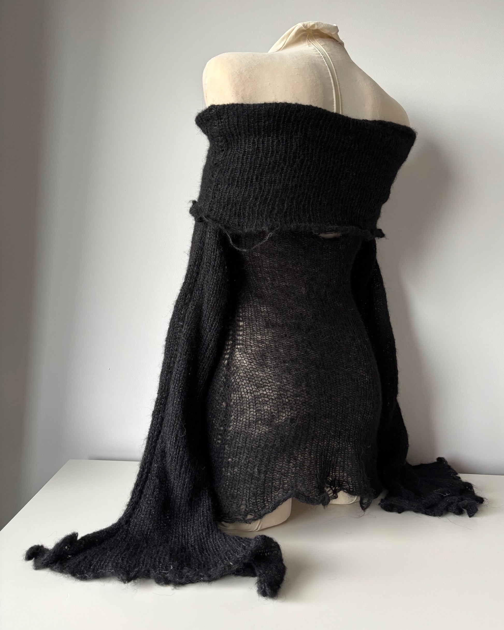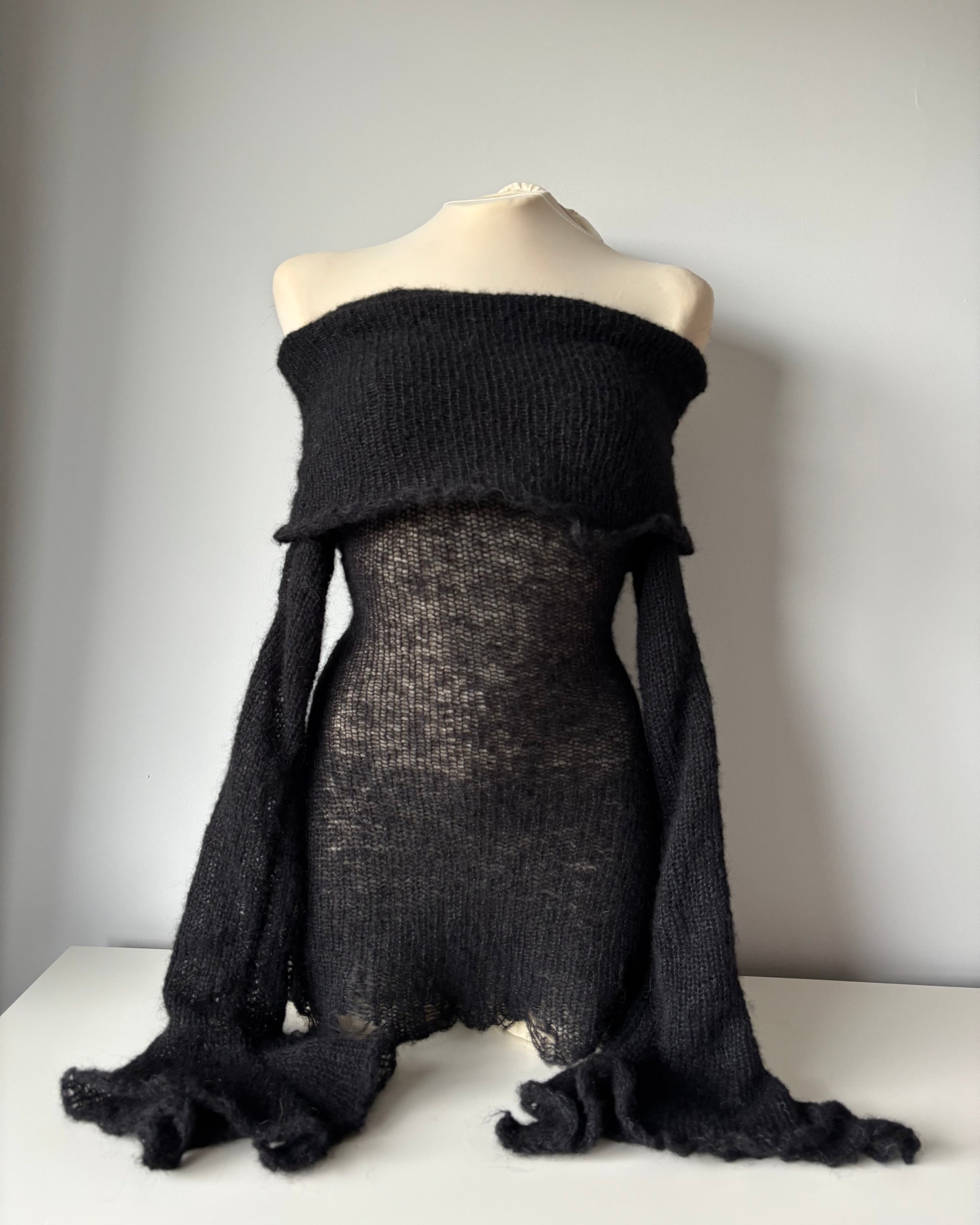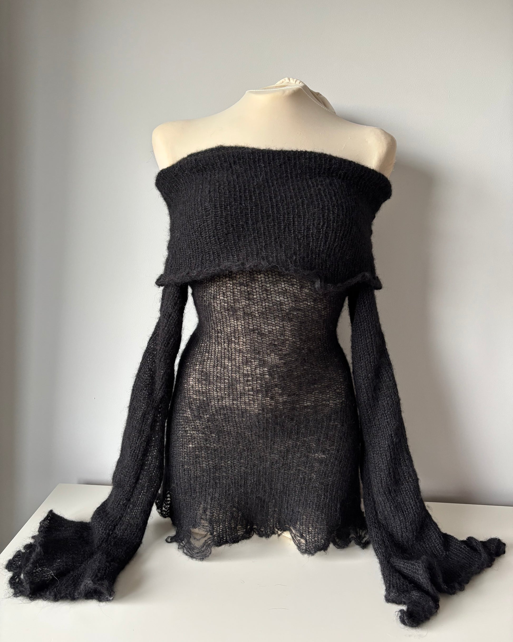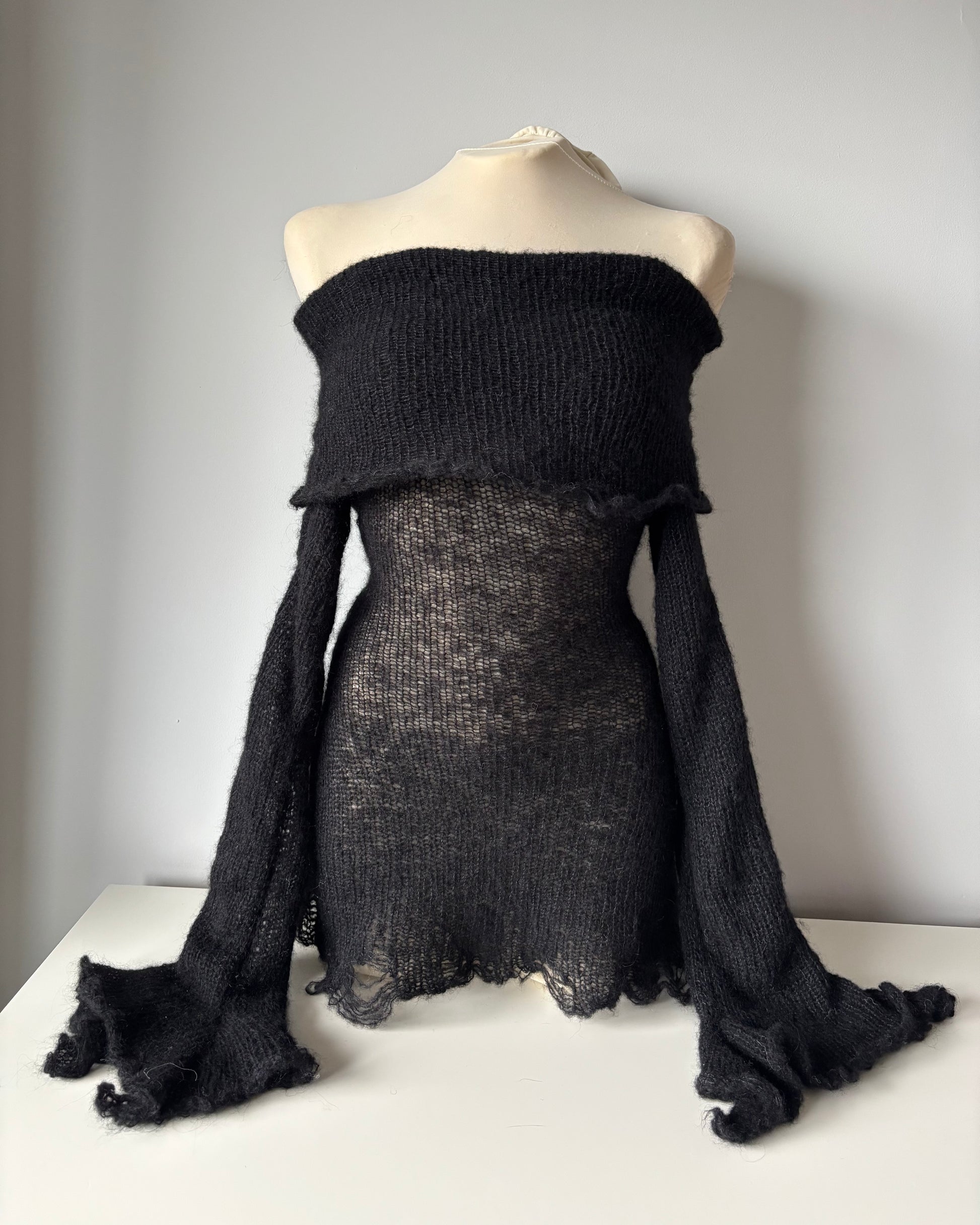 Model został zaprojektowany z odkrytymi ramionami i wbudowanym zakryciem na biust. Posiada długie, dramatyczne rękawy poszerzane ku dołowi oraz surowe wykończenia u dołu w technice distress, co nadaje całości awangardowy charakter.