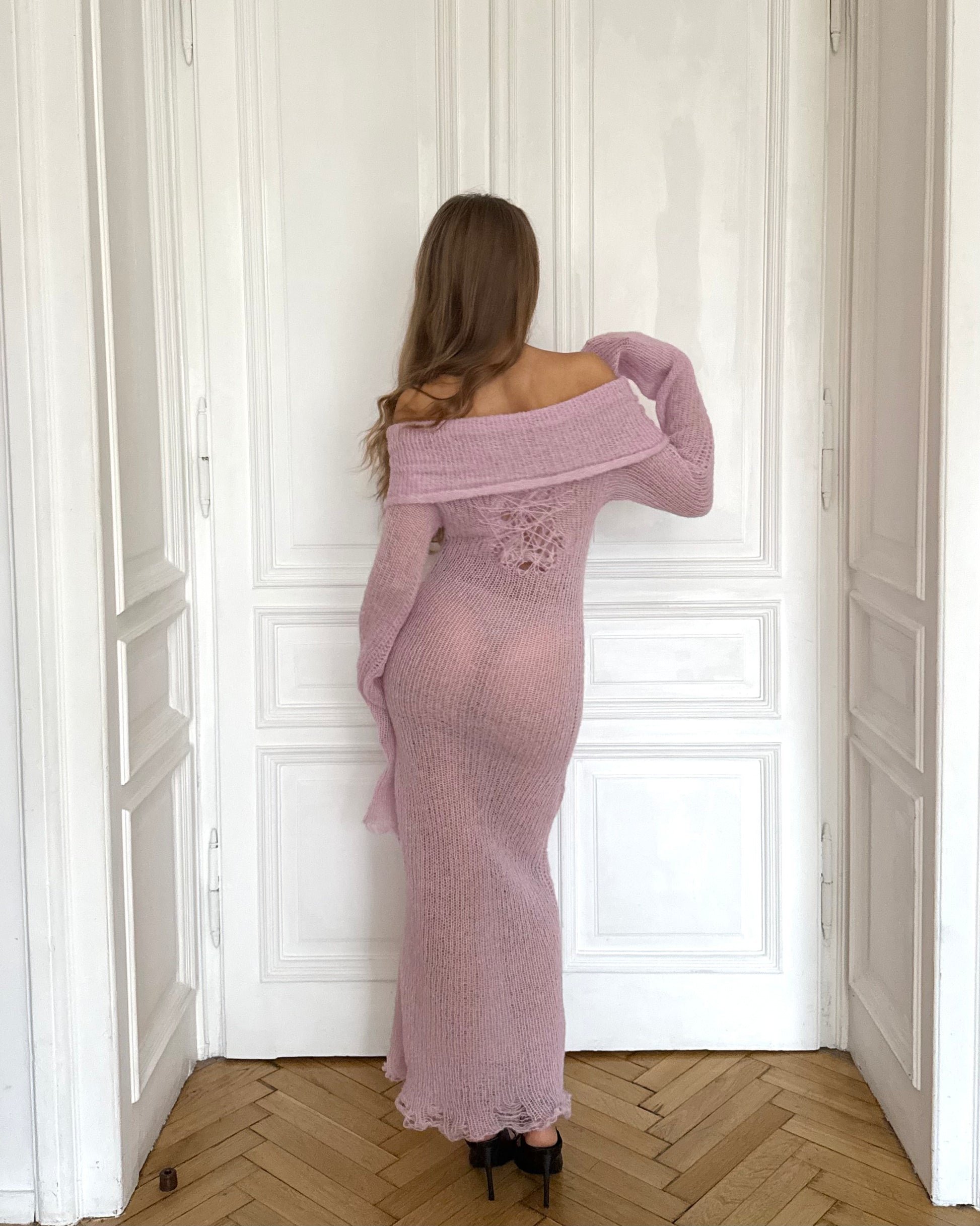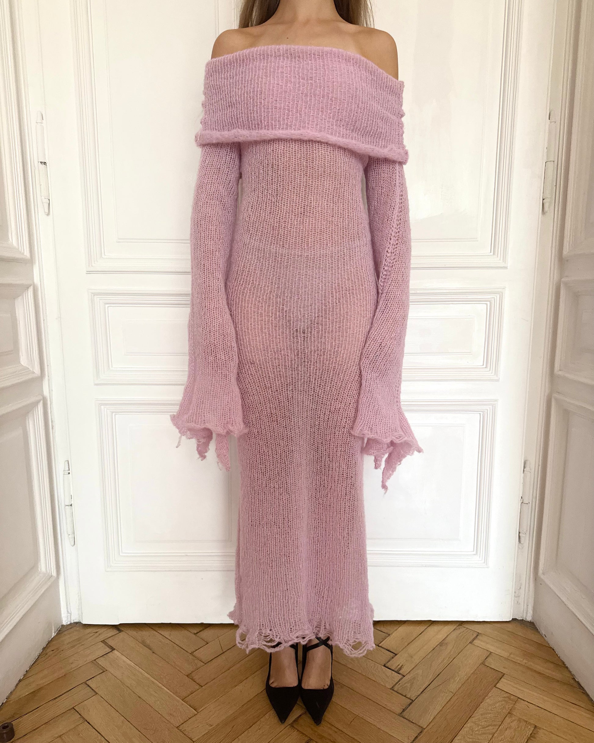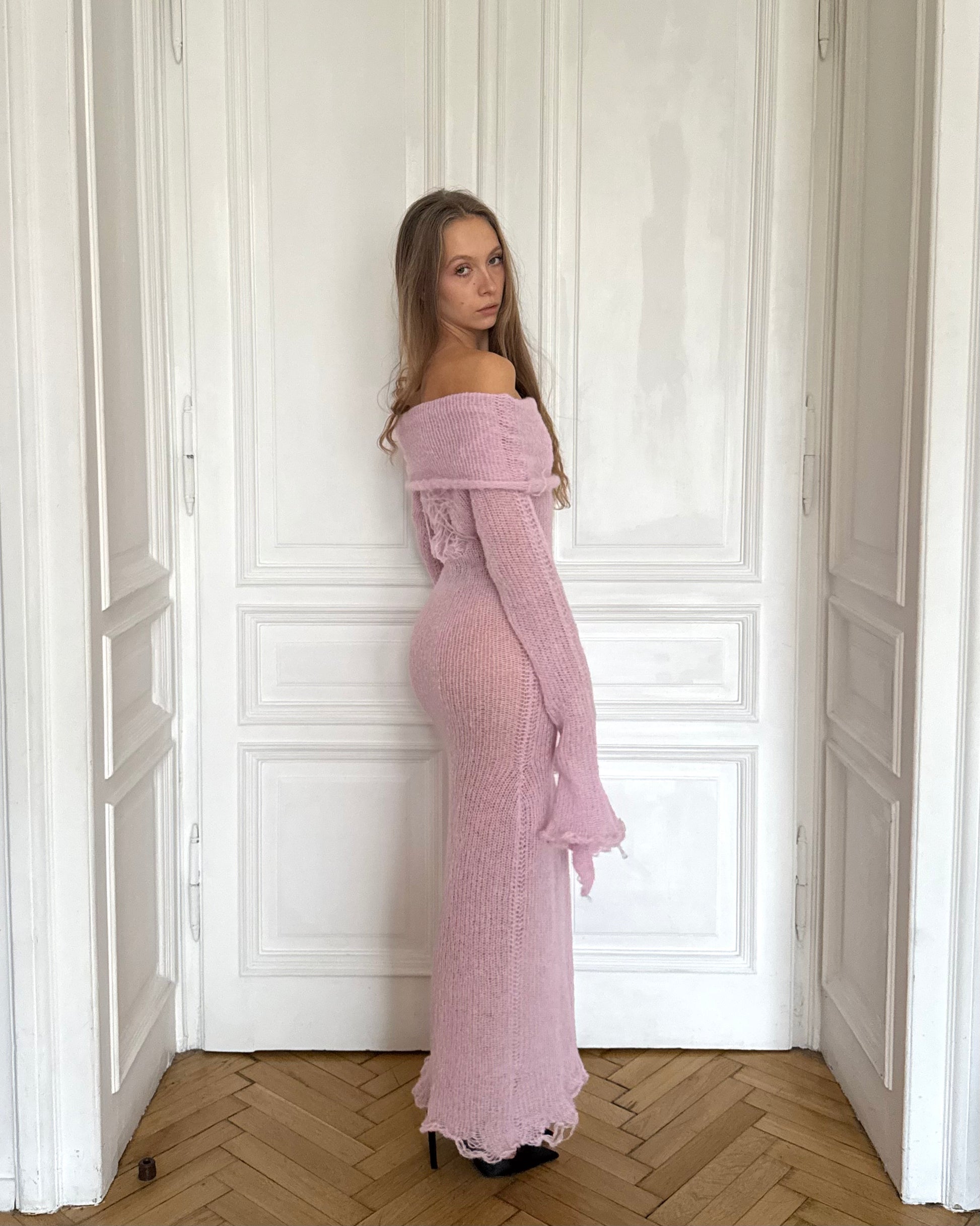 Długa sukienka z poszerzanym dołem i poszerzanymi, dramatycznymi rękawami. Wbudowane zakrycie na biust i postrzępione brzegi, nadające sukience awangardowy charakter. Dziura na plecach z wszytymi nitkami. Sukienka jest ręcznie wykonana z włóczki zawierającej 77% alpaki i 23% jedwabiu.